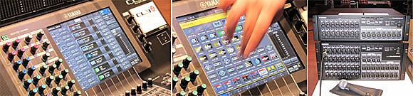 ▲Centralogicは、CLシリーズの名称の元となったオペレーションスタイルで、M7CLから受け継いだもの。ディスプレイは大型タッチパネルとなっている(写真左、中)。写真右はI/Oラックの「Rio3224-D」「Rio1608-D」。