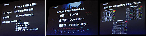 説明会では、「デジタルミキサーに求められること」として、「音質」「操作性」「機能性」が挙げられ、これに沿って機能説明が行われた。まず「音質」で触れられたのは、「原音に忠実なナチュラルサウンドの実現/高品位且つ、多彩な色付けが可能なエフェクター」。特にヤマハ独自の技術「VCMテクノロジー」によるアナログヴィンテージEQ/Compや、Ruvert Neve DesignsのPorticoシリーズに代表されるエフェクトの多彩さ・充実度がアピールされた。