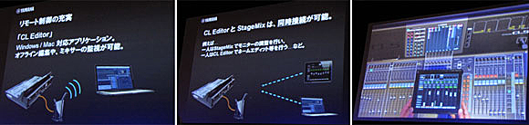 そして、一般ユーザーが最も興味を持ちそうなのが、iPadシリーズ専用の制御アプリケーション「CL StageMix for iPad」の存在だろう。これは、CLシリーズを無線LAN経由で操作ができるというもの。たとえば、コンサートホール内で、各位置での聞こえ方をチェックしながらその場で設定が変更できるのだ。また、CLシリーズ本体にiPadをセットする場所が用意されるなど、iPadがかなり重視されていることがわかる。また、Windows/Mac対応のアプリケーション「CL Editor」でのリモート制御も可能なほか、iPad用StageMixとの同時接続が可能な点もアピールされた。1人はStageMixでモニターの調整を行い、ほかの1人はCL Editorでネームエディットを行うといった具合。作業効率のアップが図れるというわけだ。