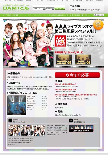全39公演12万人を動員する全国ツアー<AAA TOUR 2012 777 TRIPLE SEVEN>がついにスタートしたAAAだが、アーティストのライブ映像を見ながらカラオケを歌うことができる【カラオケDAM】の「ライブカラオケ」にて、「AAAライブカラオケ」第三弾配信が決定となった。今回のスペシャル企画は、これを記念してAAA人気カラオケ楽曲を歌うと彼らの激レアグッズが抽選でプレゼントされるというもの。