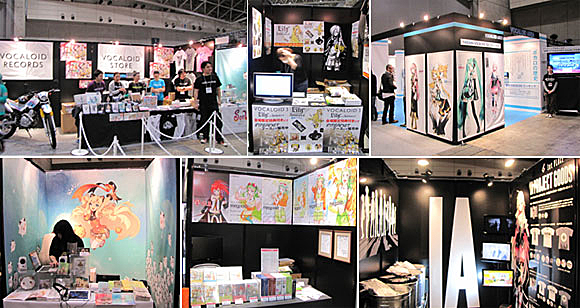 ▲エリア内にはVOCALOID関連各社による製品、グッズの販売ブースが多数。会場のみの特別価格の商品も多数。写真右上はYAMAHA VOCALOID TLFスピーカー。TLFスピーカーは見た目は布のような薄型・軽量の静電スピーカー。