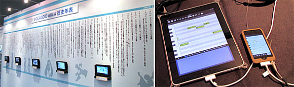 ▲VOCALOIDに関する出来事がまとめられた歴史年表も展示。ニコニコ動画での動きについても詳しい。iPad/iPhone用アプリケーションiVOCALOIDやVocaloWitterは実際に試せる状態で用意。