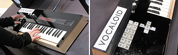 ▲VOCALOIDをリアルタイムで演奏できるキーボード「VOCALOIDキーボード」。左手の日本語入力インターフェイスから子音と母音を指定、右手の鍵盤で音程を決めて発音させる。中味はPCではなくVOCALOID-boardが内蔵されている。製品化の予定はないが、「熱い要望があれば、もしかしたら…?」とのこと。