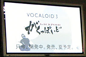 インターネットからは村上社長が登場。VOCALOID2版に続きVOCALOID3版も登場した「Lily」(4月19日発売)について、よりリアルにより人間らしくを目標にしたことをアピール。「Megpoid」については6月9日の誕生祭をやりたいとも。また、「Singer Song Writer Lite 7」に「Megpoid」ライブラリ5種類(うち1つをアクティベーションして利用)とEditorをバンドルしたスペシャルパッケージ(5月25日発売)の発売、「CUL」については喜多村英梨さんがパーソナリティを務め、CULの曲やVOCALOIDの話題を取り上げているラジオ番組(文化放送、火曜日23:00から)について触れた。そして、「がっくっぽいど」のVOCALOID3版が開発中、夏発売予定であることなどを紹介。「かなり中の人に近づいたんじゃないか」と自信を覗かせた。