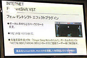 さらに、同社製品の登録ユーザーに無償配布される「フォルマントシフトエフェクトプラグイン」の発表も行われた。こちらは、ボーカル素材のキャラクターを変更するVSTエフェクトプラグインで、VOCALOID Editorのジェンダーファクター同様の効果をリアルタイムでオーディオデータに適用できるというもの。DAWでのミックスの最中でもVOCALOID Editorに戻らずにボーカルを調整できるというわけだ。ピッチシフトを加えた有償版も予定されている。