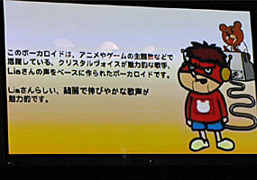 AHSからは尾形社長が登場、「結月ゆかり」(2011年12月発売)の企画を行ったボカロマケッツの2人とともに、意外と知られていないというパッケージの収録内容を紹介した。どうやって曲が作られているか、どうやって歌わせるかがわかる楽曲データ、ブレスや子音の補助、セリフ素材を400種類以上を収めた音声データexVOICEが収録されている点をアピール。さらに、exVOICEについては、登録ユーザーがダウンロードできる素材がどんどん追加されていることが語られた。