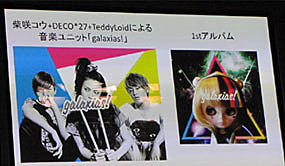 最後は、ニコニコ動画で行われている「VOCALOID3楽曲コンテスト」について。再生数が1000回突破で、発売予定のないVOCALOID3ライブラリがプレゼントされることをあらためて強調、そしてそのライブラリがこのステージで発表された。スクリーンに流されたのは柴咲コウ+DECO*27+TeddyLoidによる音楽ユニット「galaxias!」の楽曲のビデオクリップ。同ユニットのキャラクターとして、柴咲コウのアイディアで誕生した「galaco(ギャラ子)」がVOCALOID化されるというのだ。galacoのVOCALOID3のキャラクターイラストは、初音ミクやLilyを手がけた人気絵師KEI氏。気になる中の人は非公開、「みなさんのご想像におまかせします」とした。制作はインターネットの村上氏、DECO*27とTeddyLoidによるデモ曲も計画、企画はヤマハとスターダスト音楽出版が担当する。VOCALOIDでの楽曲制作に自信がある人はもちろん、中の人が気になる人もコンテストにチャレンジしてみよう。