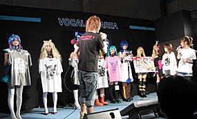 ▲VOCALOID NEWSの最後に紹介されたのは、VOCALOID STOREで販売が開始されたTシャツ。VOCALOIDのキャラクターのコスプレイヤーがステージへ。