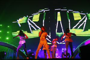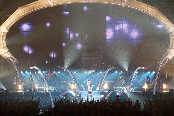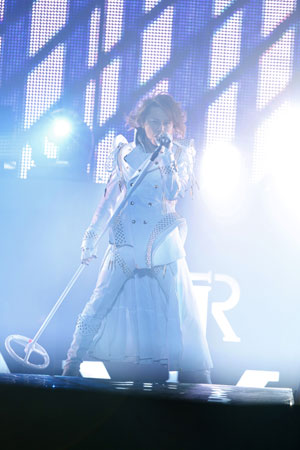 後半。いったんステージ下に消え、全身黒の衣装に着替えて再び現れた西川は、まさに15周年イヤーの中で生まれた「Naked arms」「SWORD SUMMIT」「FLAGS」といったキラー・チューンを放ち、ますます会場を燃え上がらせる。昔からの定番曲やヒット曲で盛り上がるのはもちろん、それ以上に最近の曲で盛り上がる、というライヴはとても健全で、それ自体、T.M.Revolutionの無尽蔵な底力と無限の可能性を証明しているように思えた。