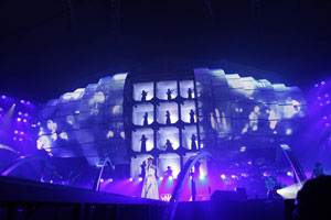 会場が暗転すると、まず目に飛び込んできたのは、T.M.R.のロゴや数字を映し出す、巨大な楕円形立体スクリーン。それが徐々に上に移動し、左右に開くと、その奥から全身真っ白な衣装をまとった西川貴教が登場。彼は大歓声の中、初期の頃のナンバー「BRACK OR WHITE」を豪快に放ち、勢いよくライヴをスタートさせた。