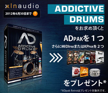 今回のキャンペーンは、人気ドラム音源「Addictive Drums」を購入すると、好きな専用拡張パック“ADpak”を1つ、さらに“MIDIpak”または“KitPiece pak”を2つプレゼントするというもの。Midipak、KitPiece Pakがもらえるのは日本だけとのこと。