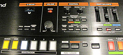 コントローラー: Dビーム・コントローラー、ピッチ・ベンド/モジュレーション・レバー、アサイナブル・ボタン([S1]、[S2])、アサイナブルつまみ([CUTOFF/C1]、[RESONANCE/C2])、パート・レベル・スライダー(PERC/LOWER、UPPER、SOLO)