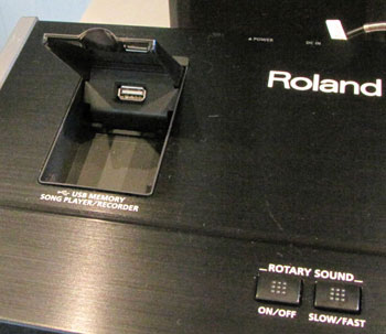 ▲トップパネル左上のカバー内にはUSBメモリー端子を装備。写真右下に見えるのはロータリースピーカーのコントロール用ボタン。