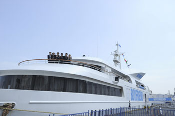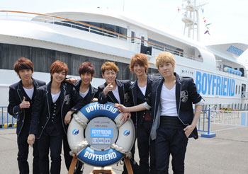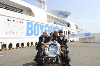 この記者会見は日本初上陸を語るにふさわしく、日本の海の玄関である東京湾上で行われた。豪華客船シンフォニークラシカ船体にグループロゴをプリントした“BOYFRIEND号”が、日の出ふ頭を出港。東京スカイツリー、東京ゲートブリッジ、東京タワー、羽田空港、レインボーブリッジと、日本のメディアを乗せて東京湾をハート型に運行した。
