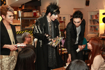 そんな異様な盛り上がりに更なるあおりを見せたのが、頭からつま先まで見事にアダム・ランバート風スタイルに身を包んで登場したデーブ・スペクターだ。デーブは、2010年のアダム・ランバート初来日時に取材で対談し意気投合、今回日本のリリース・タイミングに来日できなかったアダム・ランバートに代わって1日店長に就任したものだ。