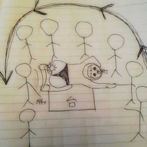 台の上で四つんばいになった千葉さんを参加者たちがU字型で囲み、千葉さんは握手をしがらお尻を“パチッ”とペンペンされる、というこのイメージ図に描かれた前代未聞の光景が、果たしてどのような形で実施されるのか。あなたの目と手で、確かめてほしい。