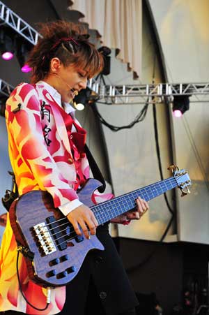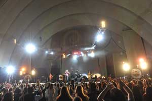この日、シート席はソールドアウトとなっていたが、その後ろに設けられた芝生席の順番を待つ人たちで、会場前には長蛇の列ができていた。日本から来たファンと現地のファン合わせて5000人以上がそこに集まった。10万人を軽く越す動員を持つL’Arc~en~Cielには小さ過ぎる会場だ。しかし。シェル(貝)をイメージして作られたそのステージは、ここでしか見られないL’Arc~en~Cielのライヴに、最高の景色をプレゼントしてくれたのだった。
