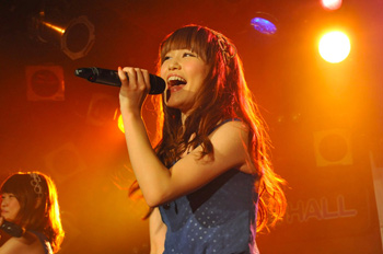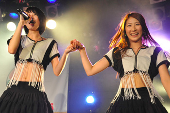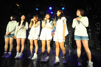 続く2組目は、福岡発の大所帯アイドル・ユニット、LinQ。今回は天野なつ、岸田麻佑、桜愛美、杉本ゆさ、高木悠未、原直子、松村くるみ、瑞稀もえ、桃咲まゆ、山木彩乃の10人が、彼女たちの魅力をギュッと凝縮したようなステージをノンストップで展開。T-Paletteでの最初のシングル曲「カロリーなんて」から始まり、祭囃子とサンバのリズムが合わさった陽気なサウンドに緑のペンライトを使ったダンス、そして高木悠未がハッピを纏ってコブシを回すソロ・パートなど見どころ満載の新曲「祭りの夜~君を好きになった日~」、未CD化でありながら人気の高い「チャイムが終われば」、エモーショナルな「for you」と続き、ラストの「shining star」ではメンバーとフロアが一丸となってタオルを振り回し、爆発的な盛り上がりのなかMC抜きで全5曲を一気に駆け抜けた。トークの締めを任された高木悠未は、坂東英二のモノマネで「ほっば、みねわきしゃちょうサイコー!」というメッセージで会場を沸かせた。