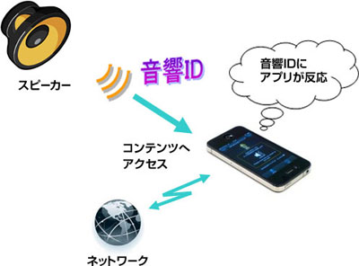 スピーカーから出た短い情報符号(音響ID)を携帯端末のマイクで受信し、サーバーとの連携でURL情報に変換する仕組みを用いることで、ユーザーはスピーカーに近づくだけでクーポンを受け取ったり、eコマースのサイトにアクセスしてショッピングができるなどのサービスを受けたりすることができる。