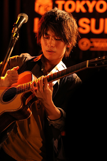 最初に登場したのは伊藤祥平。アコースティックギターの弾き語りというスタイルながら、パーカッションのようにギターのボディを叩いたり、指全体を使ってかき鳴らす独自の躍動的なギター奏法で会場を魅了した。途中、影響を受けたというエリック・クラプトンのカバー「愛しのレイラ」を披露。エレキギターのフレーズもアコースティックギターで情熱的にアレンジされ、オーディエンスも圧倒されたようにステージを見つめていた。