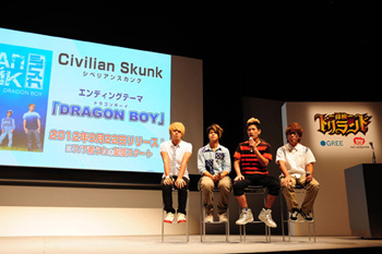 8月22日のメジャーデビューを控え、Civilian Skunk(シベリアンスカンク)のデビューシングル「DRAGON BOY」が、テレビ東京系アニメ「探検ドリランド」エンディングテーマに決定し、6月28日東京国際フォーラムにて開催された記者発表会にてメンバーが登壇した。