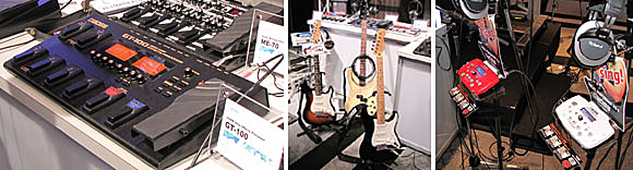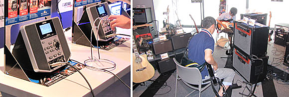 ▲ローランド製品では、BOSSマルチエフェクターのフラッグシップGT-100、ギター・モデリングのV-Guitarシリーズ、マイクスタンドにセットされたボーカル用エフェクターVE-5など新製品がずらり。すべて試奏可能な状態でスタンバイ。