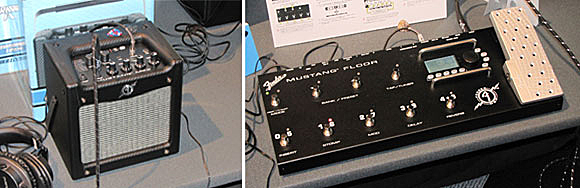 ▲FenderのモデリングアンプMUSTANGシリーズのMustang新モデルとして、コンパクトでかわいいGustang Mini(写真左、18,900円)、フロアタイプのMustang Floor(写真右、39,900円)がいちはやく展示。こちらも多くの試奏者を集めた。いずれも発売は秋を予定。