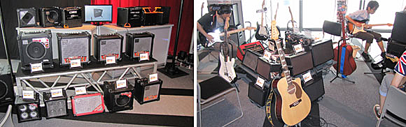 ▲入ってすぐのスペースには7月発売のローランド新モデルeBand JS-10がずらり。アンプモデリング&エフェクター、スピーカー内蔵でいつでもすぐにセッションが楽しめるオーディオ・プレーヤーは多くの試奏者を集めていた。またアンプでは、発売されたばかりの新開発プログレッシブアンプ搭載ステージ用アンプGA-212、GA-112が注目の的。