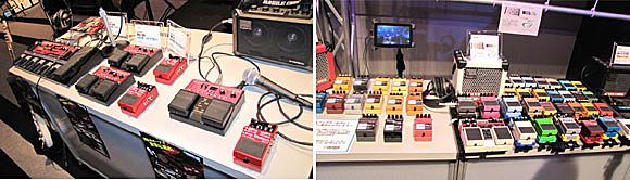 ▲声や楽器でループパフォーマンスが楽しめるLoop Stationは、コンパクトからフロアタイプまで多彩にラインナップ。ギタリストには欠かせないBOSSコンパクトシリーズは驚くほどのバリエーションをこれでもかと展示(これでもほんの一部)。