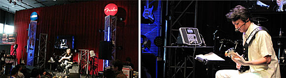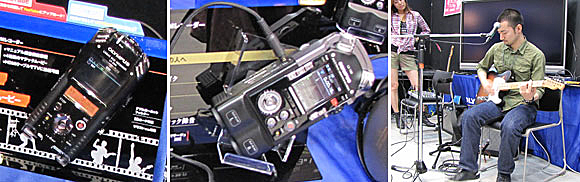 ▲オリンパスのブースでは、HD映像もとれるレコーダーLS-20M(写真左)や、ステレオマイク内蔵のマルチトラックレコーダーLS-100(写真中)などを展示。Fender G-DEC3の音源をバックにギターソロを演奏、LS-20Mで収録する「ギターソロコンテスト」も開催。また、ブース内では在日ファンクのギタリスト仰木亮彦によるLS-100のデモを披露。自宅で収録した身の回りの音をリズム代わりに、ギターをその場で録音、さらにボーカルを乗せてみせた。