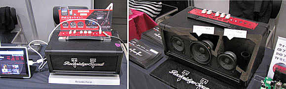 ▲エレクトリック・ギターゾーン入り口に設けられたロックリッジサウンドジャパンのブースでは高見沢俊彦とのコラボによるギター・アンプ搭載iPodスピーカー「Jam Tube」が注目を集めた。iOSデバイスをバックにギター演奏が楽しめるJam Tubeは、専用接続ケーブルでiOSデバイスと、ギターとはシールドを接続して使用。スピーカーはギター用(モノラル)とiOSデバイス用(ステレオ)の3つで構成。真空管アンプ(12AX7)によるナチュラルな音楽再生が楽しめる。会場および同社のオンライン販売価格は34,800円。