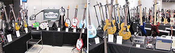 ▲VOXはスピーカー&リズムマシン内蔵のユニークなシェイプのトラベルギター「APACHE」が注目の的。TOKYO GUITAR SHOW用の特別カラーのAPACHEも展示。もちろん、VOXアンプも多数用意。