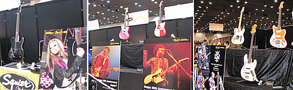 ▲Squier by Fenderブースには、アブリル・ラビーン、山中さわお(the pillows)、の子(神聖かまってちゃん)、SCANDALのメンバー(HARUNA、MAMI、TOMOMI)が使用したモデルが、カメラを持った来場者の人気を集める。
