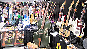▲ロカビリーに欠かせないウッドベースを製作してきたKING DOUBLE BASSによる新ブランドBLAST CULTの製品を展示したトーラスコーポレーション。ウッドベースOne4Five(写真中央)やギターのMARQUISなど個性的なモデルがずらり。