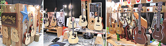 ▲Matinブースではアコースティックギターに加え人気のウクレレやトラベルギターのBackpackerなども数多く展示。同社のアコースティックギターの特徴であるブレーシングの構造がわかる展示も。