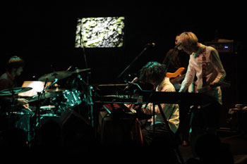 続く「Fireworks」は手作り風の線画映像が2台のモニターに映し出されて、どこかほのぼのとした味わい。「Flowers On The Wall」では石毛とノブがエレピとギターを途中で交替するなど、セッションの自由な進化形を展開した。