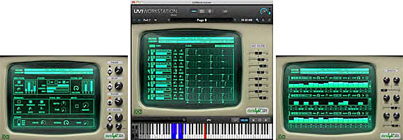 ▲ベース、ブラス、ストリングス、オーケストラヒットなど250以上の音色プリセットが用意され、多彩なシンセパラメーターでオリジナル音色も作成可能(画面左)。ステップシーケンサーを装備した80年代スタイルのビートボックスも装備(画面中)。この画面はUVI Workstationで立ち上げたもの。3基のスマートステップシーケンサーと3つのサウンドを設定できる3パートのフレーズプロセッサーも用意(画面右)。