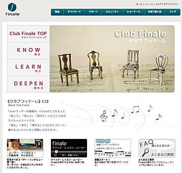 「クラブフィナーレ」は、FinaleユーザーがFinaleのことをもっと「知って」「学んで」「深めて」もらうために、Finaleユーザーへのサービスの一つとして開設されたスペシャルサイト。このクラブフィナーレのオープンにあわせて、Finaleメールニュースも「クラブフィナーレ通信」と題してリニューアルしている。