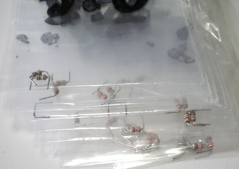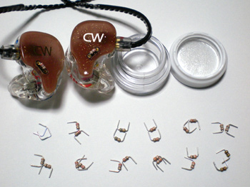 CW-L51 PSTSには交換用の抵抗が最初から用意されている。0Ω、2.2Ω、5.6Ω、8.2Ω、12Ω、15Ω、18Ω、22Ω、27Ω、33Ω、39Ω、47Ωという12セットが付属しており、各々の間には86Hzでおおよそ2db程度の差異があるという。ちょうどテレビのボリュームが1ステップ2db程度とのことなので、その幅の違いは何となく想像つくだろう。私は、とっとと自分の好みの低域量にして…「低域大好き人間としては、きっと最少抵抗値だろうな、もしかしたら抵抗なしの0Ω直結かもしれん、うへへ」と楽観視、いずれにしろ音出しをしてさくっと使用抵抗値を決定し、5000円追加の「コーティングサービス」で、抵抗をクリアUV樹脂でもっこりとコートしてもらおうと思っていた。
