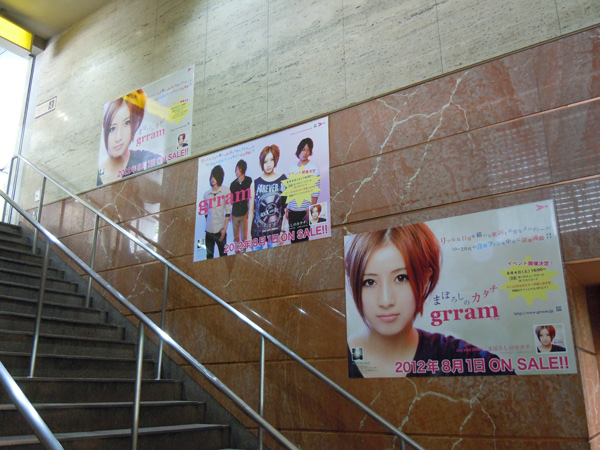 8月1日にリリースとなるgrramのセカンドミニアルバム『まぼろしのカタチ』発売を記念し、7月30日(月)に大阪・心斎橋OPA1F~御堂筋線心斎橋駅に繋がる階段及び踊り場に、特大ポスターが12枚掲出されている。壁にポスターが貼られているだけの状況なのだが、スピーカーがどこにも無いにも関わらずgrramの楽曲が流れているという何とも不思議な状況にある。