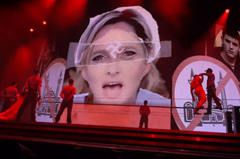 マドンナはパリでのパリ祭コンサートの際、フランスの極右国民戦線党リーダー、マリーヌ・ル・ペンの額にナチスの象徴である卍章をつけた映像を流し、騒動となった。今回のショーはその騒動後に報じられたものだ。Le Parisien誌によると、マドンナは観客に「マリーヌ・ル・ペンが私に腹を立てていると聞いたわ」「敵を作ろうとしているわではないのよ」などと語っていたそうだ。