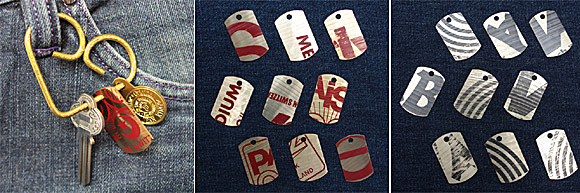 ▲ジーンリングとドッグタグのセット。ドッグタグは赤(写真中央)と黒(右)の2種類のカラーをラインナップ。ドッグタグのサイズは24mm×40mm。