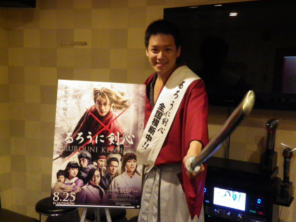 そして、その“るろう人”がこの日訪れたのは、渋谷のカラオケルーム・ビッグエコー渋谷店。大勢の人でにぎわう夏休みの渋谷に突然表れた“サムライ”の姿に街じゅうがビックリするなか店内へ歩を進め、『るろうに剣心』テレビアニメ版のエンディングテーマとして大ヒットしたSIAM SHADEの「1/3の純情な感情」を熱唱!