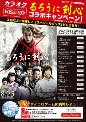 | ▲ビッグエコー渋谷店で展開中の「るろうに剣心」コラボキャンペーンは8月31日まで。 |