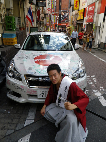 その話題の映画の魅力を一人でも多くの方へアピールするべく、まさに“るろうに”よろしく流浪の旅にチャレンジしている人物をご存知だろうか。緋村剣心と同じ羽織袴に身を包み、『るろうに剣心』の豪華出演者陣からもサインとメッセージを車体にしたためてもらった愛車“るろう号”で全国47都道府県踏破に挑む“るろう人”に扮しているのは、劇団プレステージ所属の若手俳優・長尾卓也さん。