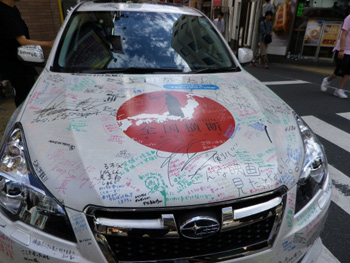 | ▲全国都道府県を走り回っているるろう号は、ボディー前面に皆さんからのメッセージがいっぱい。この中には佐藤健、武井咲、吉川晃司…といった出演陣のサインも。 |