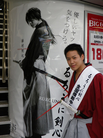| ▲神出鬼没のるろう人、この日は夏休みで多くの人でにぎわう渋谷センター街にさっそうと現れた。 |