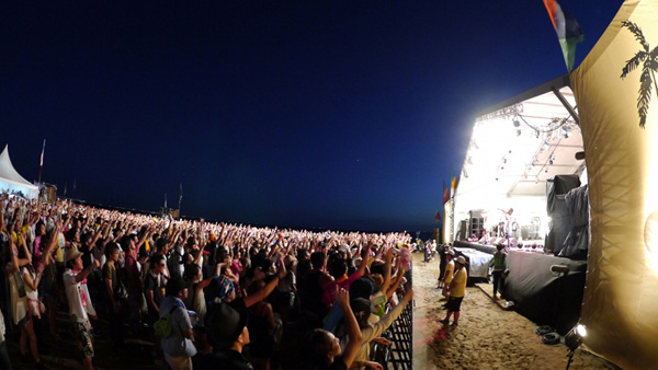 日没で暗転するとビーチサイドがカラフルなライティングで彩られ大団円へ。最後はアーティストと観客が一体化し、自然で幸せなパフォーマンスを終えた。海辺の心地よい風の中、いつまでも終わってほしくない感動に会場は包まれていた。