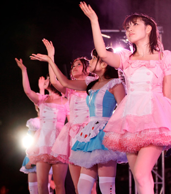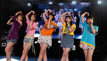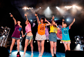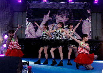 19時となりすっかりあたりは暗くなったところで「困惑コンフューズ」に突入、メンバーもファンもタオルを一斉にふり回り、大盛り上がりとなった。途中、タオルが入った鉄砲を客席にぶち放つ演出も。そのままの勢いで「チクタク☆2NITE」「Love me?」へと続き、客席のテンションもピークへ。