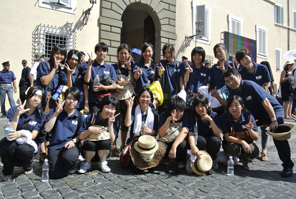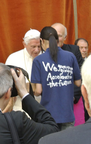 この日法王ベネディクト16世との謁見を希望し、世界各国から4000人以上を超える人々が集結していた。MJCアンサンブルからは、団長である太田絵菜さん(15)が代表して登壇し、法王ベネディクト16世に直接謁見する機会を得た。